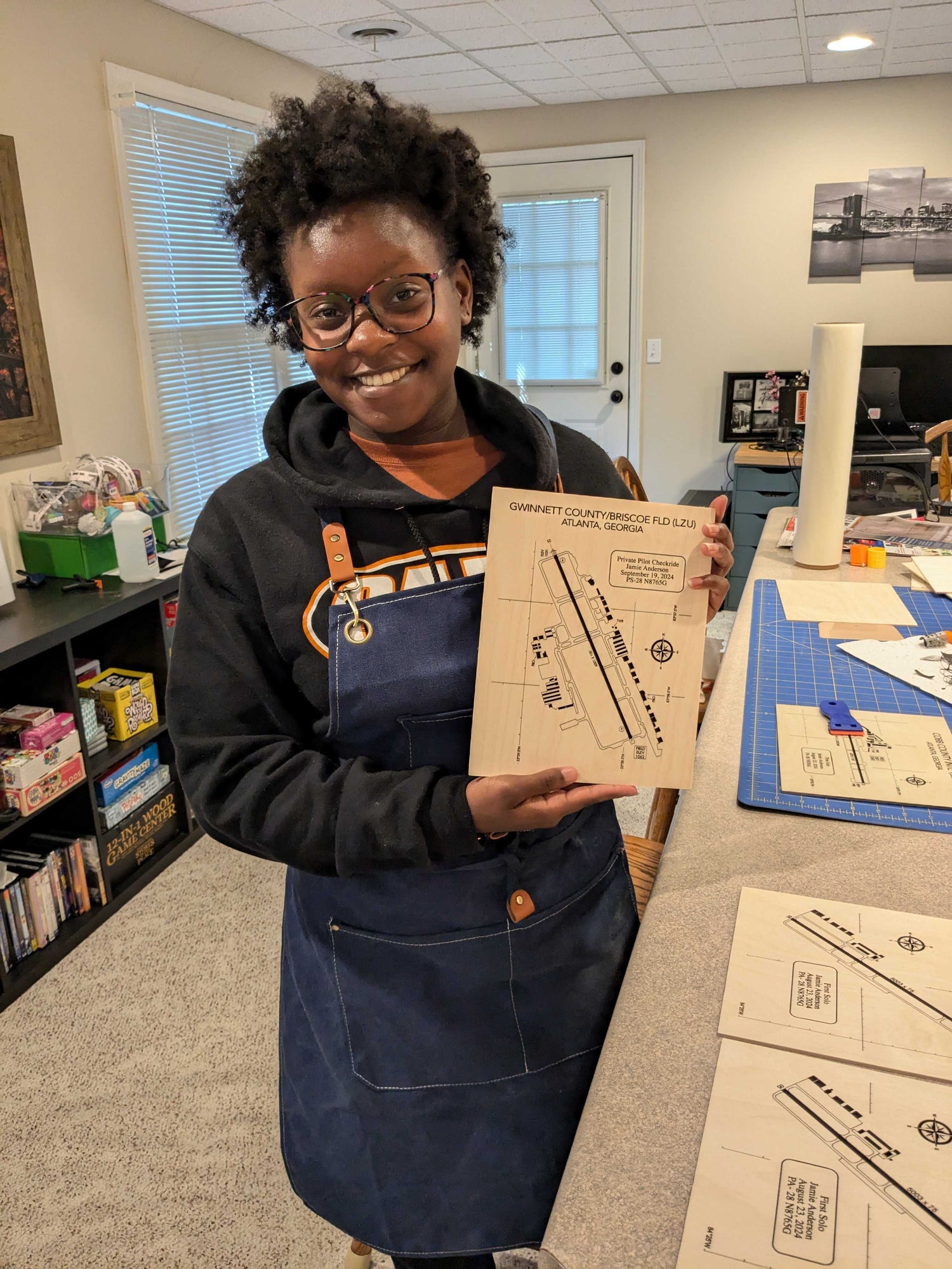Hello! I'm Laila, and I'm 18 years old. This all started when my dad got his pilot's license a couple years ago and only had his card to show for it. I thought, wouldn't it be better to get a certificate or a plaque to show and commemorate all the hard work that was put in? Well, that's where I come in! A little bit of research later, I learned how to laser engrave it into a wooden panel and frame it for you and BAM! There's your personalized plaque recognizing all your hard work!